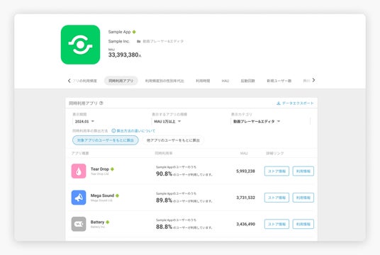 テレビにおける視聴率情報のスマホ版のような位置付けで、アプリが「いつ・誰に・どのくらい」使われているかといったデータをご覧いただけます。