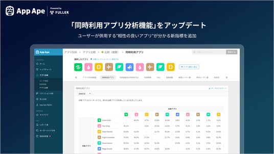 フラー株式会社(本社:新潟県新潟市、代表取締役:渋谷修太、山崎将司、以下「フラー」)は、アプリ市場分析サービス「App Ape(アップ・エイプ)」につきまして、スマートフォン(スマホ)にインストールしているアプリの併用状況を示す「同時利用アプリ分析機能」を大幅アップデートしました。対象アプリのユーザーが同じ端末で利用している割合が高い“相性の良いアプリ”を詳細に把握・比較できる新指標を追加しました。