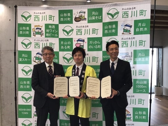 事業連携協定書締結左から、当社会長 中村、西川町 菅野町長、 当社東北営業部長 伊藤