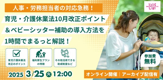 全国47都道府県で24時間スマホで呼べるベビーシッター・家事代行サービス「キッズライン」を運営する株式会社キッズライン(本社:港区六本木/代表取締役社長:経沢香保子)は、2025年10月に施行される育児・介護休業法の改正に伴い、従業員の両立支援施策を検討中の企業様に向けたオンライン説明会を開催いたします。
