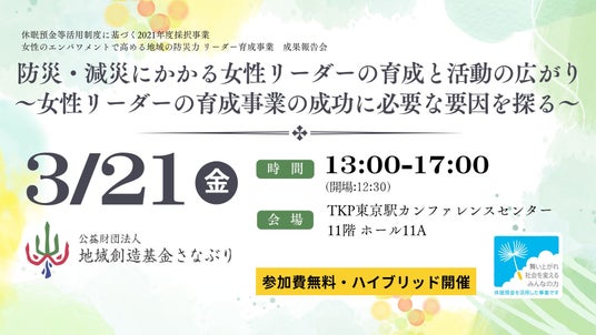 公益財団法人地域創造基金さなぶり (所在地:宮城県仙台市、理事長:大滝精一)は東日本大震災による避難所その他による助成の権利侵害や尊厳に関わる問題等を踏まえ、休眠預金制度を活用した「女性のエンパワメントで高める地域の防災力 リーダー育成事業」として、平時から「ジェンダー平等の視点」が地域に反映され、多様性に配慮された”しなやかな社会”が醸成されることを目標として、約2年半休眠預金制度を用いて、全国7事業に総額2.1億円の資金提供を実施しました。
