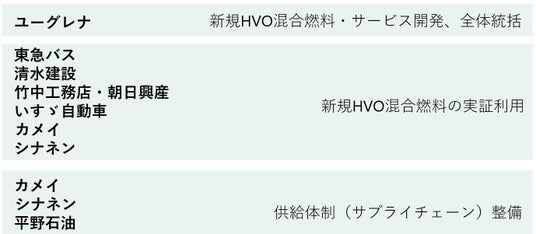株式会社ユーグレナ(本社:東京都港区、代表取締役社長:出雲充、以下「ユーグレナ」)と、東急バス株式会社(本社:東京都目黒区、代表取締役社長:古川卓、以下「東急バス」)、清水建設株式会社(本社:東京都中央区、取締役社長:井上和幸、以下「清水建設」)、株式会社竹中工務店(本社:大阪府大阪市、取締役社長:佐々木正人、以下「竹中工務店」)、株式会社朝日興産(本社:大阪府大阪市、取締役社長:宮本靖雄、以下「朝日興産」)、いすゞ自動車株式会社(本社:神奈川県横浜市、代表取締役 取締役社長 COO:南真介、以下「いすゞ自動車」)、カメイ株式会社(本社:宮城県仙台市、代表取締役社長:亀井昭男、以下「カメイ」)、シナネン株式会社(本社:東京都品川区、代表取締役社長:小松良則、以下「シナネン」)、平野石油株式会社(本社:東京都台東区、代表取締役:平野賢一郎、以下「平野石油」)の9社は、東京都の令和6年度「新エネルギー推進に係る技術開発支援事業」に、「新規HVO※混合燃料の開発及びサプライチェーン構築とその社会実装」(以下、「本事業」)が採択されたことをお知らせします。