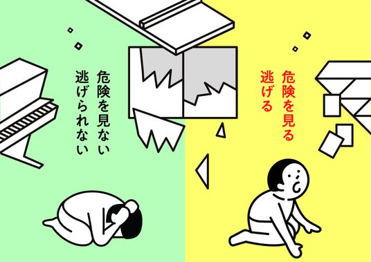 現在、多くの避難訓練では「ダンゴムシのポーズ」が推奨されていますが、この方法には大きな問題があります。実際の震災で発生する天井落下や窓ガラスの飛散といった被害を想定していないため、この姿勢だけでは命を守れないのです。危険を正しく認識し、的確に避難できる力を育むことが必要です。