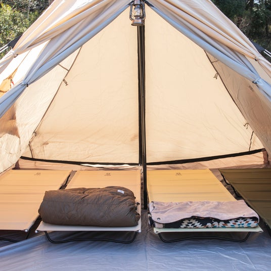 大自然の中で音楽を楽しみながら気軽にキャンプも楽しめる、キャンプビギナーにも安心の設置~撤去不要、ベッド(コット)やブランケットなど必要なアイテムも用意されているレンタルテントエリア「キ