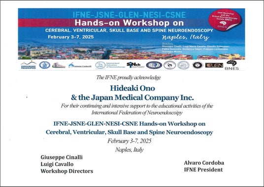 2024年2月12日から16日にイタリア・ナポリで開催された世界神経内視鏡連盟主催「IFNE-JSNE-GLEN-NESI-CSNE 脳・脳室・頭蓋底内視鏡ハンズオンワークショップ」は、IFNE(国際神経内視鏡連盟)や日本神経内視鏡学会(JSNE)、中南米神経内視鏡研究グループ(GLEN)、インド内視鏡神経外科学会(NESI)、中国神経内視鏡学会(CSNE)などの主要学会による協力のもと、イタリア神経外科学会(SINCH)、欧州神経外科学会(EANS)、世界神経外科学会連合(WFNS)の支援を得て開催されました。