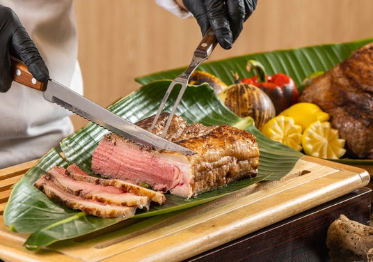ディナータイムには、ゴールデンウィーク期間限定の「和牛ローストビーフ」をご用意しております。お肉の旨みを最大限に引き出すために、ミネラル豊富な北谷の塩を使用しています。ローストビーフの「火入れ」は仕上がりを左右する最も重要な工程です。1°C単位でこだわった火入れにより、驚くほどの柔らかさと美しい断面色を実現しました。「和風おろしソース」と「ビーツヨーグルトソース」をご用意しておりますので、お好みのソースを添えてお楽しみください。さらに、ディナー限定メニューとして「ビーフステーキ」、「豚の丸焼きポルケッタ ガーリックソース添え」、「チーズフォンデュdeアグー豚のソーセージ」もご用意しております。シェフこだわりの料理とともに、心に残る特別なひとときをお過ごしください。