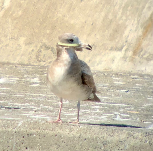 コメント:くちばしと頭の間にプラスチックがはまったウミネコの幼鳥。餌が十分に取れていないと思われる。