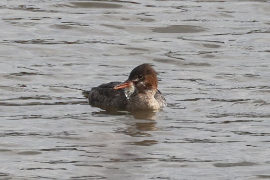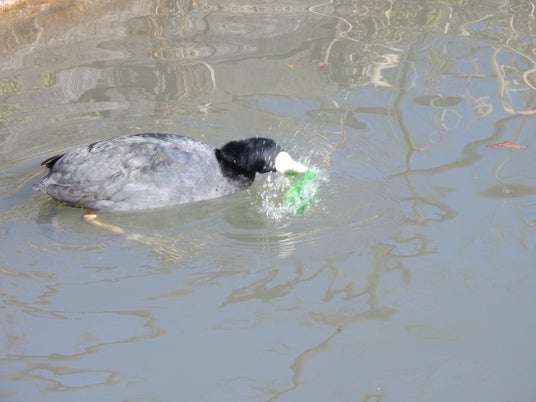 コメント:誤食したビニールがくちばしに付着し、餌が十分に取れていないと思われるウミアイサのメス。