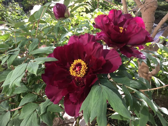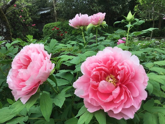 石光寺の牡丹は樹がよく育ち幹も太く、大きな葉が茂った中で大輪の花がバランスよく咲く。