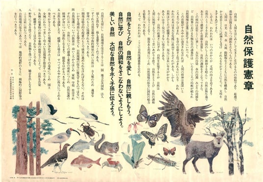 自然保護憲章は、国民の自然保護に関する指針を示すものとして、1974(昭和49)年6月5日に制定されました。1960年代の高度成長期に、海岸の埋立てや林道開発、森林伐採などが進み自然破壊が全国各地で問題化していたことを背景に、自然保護団体はじめ民間各界が集まり議論を重ね、自然保護の理念と行動をまとめ、皇太子皇太子妃両殿下(当時)がご臨席した自然保護憲章制定宣言式にて制定されました。