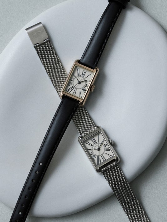 また、全国のチックタック系列店では限定モデルとして、新作『朧月/サークルローマン』のローズゴールドメッシュモデルと、ベストセラー『朧月』のゴールドケース× ブラック型押しレザーを組み合わせた2型を発売いたします。
