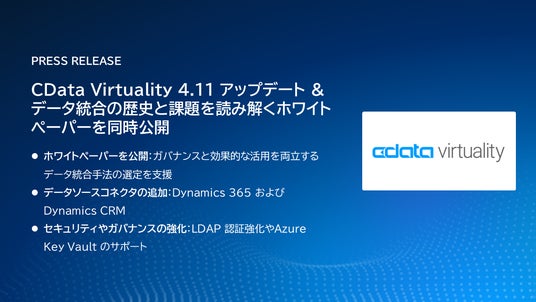 CData Software Japan 合同会社(本社:アメリカノースカロライナ州、日本オフィス:宮城県仙台市、代表社員 職務執行者:疋田 圭介、以下CData)は、データ仮想化プラットフォーム『CData Virtuality』の4.11 アップデートを公開しました。LDAP 認証の強化、Dynamics 365・Dynamics CRM の新コネクタ追加など、セキュリティとコネクティビティの向上を実現しています。また、同時にホワイトペーパー『データ統合の歴史から読み解く課題と展望-データのガバナンスと効果的な活用を両立するためのハンドブック』を公開しました。本資料では、さまざまなデータ統合手法を比較し、企業が最適な方法を選定できるよう解説しています。データ統合手法の選定にぜひご活用ください。