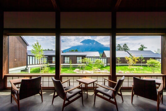 エントランスからの通路を抜けると、羊蹄山が絵画のように現れるラウンジ