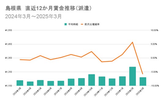 島根県では、2025年1月から同年2月にかけて、複数企業で出稿されていた募集賃金が1,200円未満の求人が掲載終了し、高時給求人の割合が高くなった影響で平均賃金が増加。2025年2月から同年3月にかけては、特定の人材派遣企業が募集賃金1,050円未満の求人を複数出稿した影響で高時給求人の割合が小さくなり、平均賃金が減少しました。