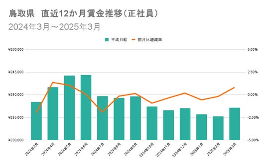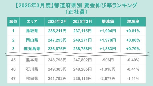 正社員の都道府県別賃金伸び率ランキング(前月比)トップ3は、1位が鳥取県(増加額+1,904円、増加率+0.81%)、2位が岡山県(増加額+1,978円、増加率+0.80%)、3位が鹿児島県(増加額+1,883円、増加率+0.79%)でした。