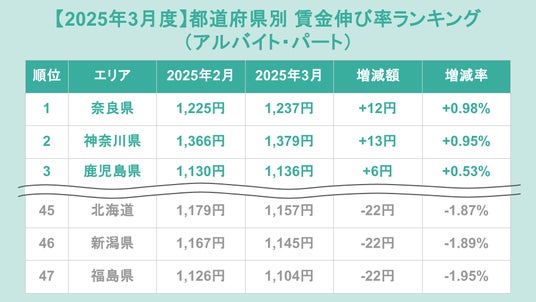 アルバイト・パートの都道府県別賃金伸び率ランキング(前月比)トップ3は、1位が奈良県(増加額+12円、増加率+0.98%)、2位が神奈川県(増加額+13円、増加率+0.95%)、3位が鹿児島県(増加額+6円、増加率+0.53%)でした。