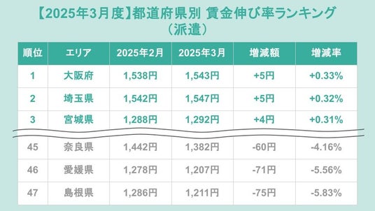 派遣の都道府県別賃金伸び率ランキング(前月比)トップ3は、1位が大阪府(増加額+5円、増加率+0.33%)、2位が埼玉県(増加額+5円、増加率+0.32%)、3位が宮城県(増加額+4円、増加率+0.31%)でした。