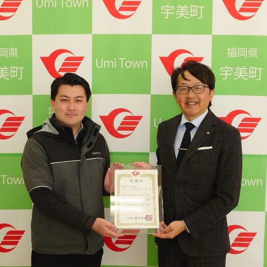 2025年2月25日には、福岡県宇美町より、企業版ふるさと納税制度を活用した寄附を行ったことに伴い感謝状贈呈式が開催されました。当日は、ガリバー太宰府インター店にて安川町長からストアマネージャーの並木氏に感謝状が贈呈されました。