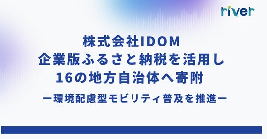 株式会社カルティブ(本社:神奈川県横浜市、代表取締役:池田 清)は、運営する企業版ふるさと納税を活用した地域課題解決プラットフォーム「river(リバー)」にて、株式会社IDOM(本社 東京都千代田区、代表取締役社長 羽鳥 由宇介)が、企業版ふるさと納税を活用した循環型社会応援プロジェクトを組成し、16の地方公共団体に対し寄付を行いましたことを報告いたします。