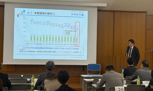 2月5日、東京都高等学校給食研究協議会が主催する「東京都高等学校給食研究協議会研究発表大会」において、ヤマタネ 食品本部の社員が「令和6年産米穀動向」に関する講演を行いました。講演では、今年度の米の生産状況や価格動向、安心・安全な供給体制について解説しました。
