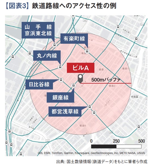 鉄道路線へのアクセス性は、対象ビルの半径 500m 圏内もしくは最寄り駅における鉄道路線数を表します。具体的には【図表 3】のように、オフィスビルごとに半径 500m 圏内に立地する鉄道駅を抽出し、乗り入れている路線数を算出します。図に示した銀座四丁目に立地するビル A では、半径 500m 圏内に有楽町駅や銀座駅などが立地しており、山手線や銀座線をはじめ合計 7 路線にアクセス可能です。半径 500m 圏内に駅が立地していない場合は、最寄り駅における鉄道路線数を算出します。