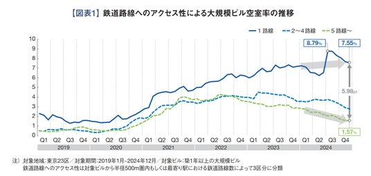 【図表1】は、東京23区内における築1年以上の大規模ビルを対象に、周辺の鉄道路線数(【付録】参照)によってグループ分けを行い、空室率を集計したものです。周辺に鉄道路線が1路線しかなく、交通利便性が低いビルの空室率はコロナ禍以降上昇が続きました。2024年初頭は低下傾向が見られたものの、2024年7月には8.79%まで上昇しています。これは、交通利便性が低い立地で2023年に竣工したオフィスビルが、まとまった面積の空室を抱えた状態で築1年を迎えたためです。その後は、交通利便性が低いビルの空室率も低下していますが、2024年12月には7.55%と、依然として高い水準で推移しています。