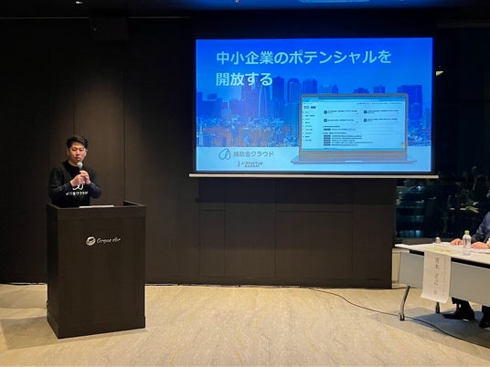 弊社代表の佐藤は、補助金活用を通じた経営支援DXサービス「補助金クラウド」について発表しました。「補助金クラウド」は、国や自治体が提供する3,000種類以上の補助金を統一フォーマットでデータベース化し、企業ごとに活用可能な補助金を自動抽出、さらに、AIを活用して申請書の草案を作成するSaasです。本大会では、補助金の活用による企業成長の可能性や、当サービスがもたらす経営支援の革新性が高く評価され、優勝という結果を収めました。
