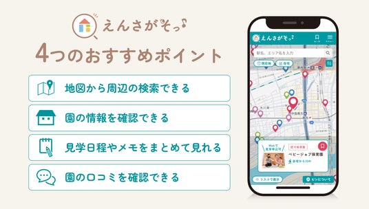 保護者は、「えんさがそっ♪」を利用することで、自宅や現在地付近の保育施設を地図上で簡単に検索できたり、気になる保育施設をお気に入り登録して後からまとめて見返せたり、お問い合わせや見学の申し込みをすることができます。授乳中や子どもが寝ている間でも、時間や場所を問わずに気軽に活用できるので、「保活」がもっとスムーズに行えるようになります。