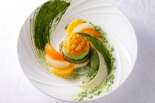 高級抹茶“霧の音”の香り高い風味が味わえる一品です。柑橘とマンダリンクリームのマリアージュをお楽しみください。