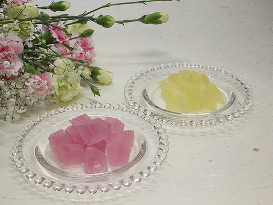 京菓子をもとに砂糖や赤ワインを混ぜあわせて独自の製法で作られた「ぶどう氷」は、薄くコーティングした砂糖のシャリシャリした食感ととろけるような寒天の食感をお楽しみいただけます。