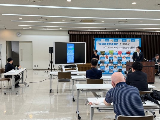 7月12日、記者会見で「つながりよりそいチャット」について登壇・発表する山形市の佐藤孝弘市長と、概要について説明するフローレンス桂山(左端)。