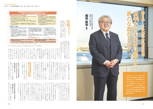 巻頭スペシャルインタビューでは、東京学芸大学教職大学院の堀田龍也教授/学長特別補佐に、次期学習指導要領の改正に向けた現状と課題についてお話しいただきました。「質の高い、深い学びを実現し、分かりやすく使いやすい学習指導要領の在り方」、「多様な子供を包摂する柔軟な教育課程の在り方」といった、次期学習指導要領に関する議論の内容を詳しくご説明いただきました。さらに、「端末やクラウドといったデジタル技術を活用し、多様化する子供たちに対応した新たな学びの形が検討されていきます」と、今回の諮問が、新たな時代の学びを創造する重要な転機となるだろうと指摘されています。15年先の未来を見据えた新たな教育とは何か-先生方や教育委員会の方々に期待することも語られています。