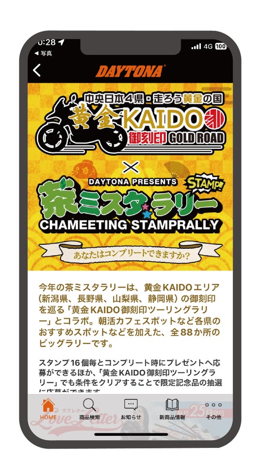 株式会社デイトナ(静岡県周智郡森町一宮4805 代表取締役 織田哲司)は、自社が提供するスマートフォン専用アプリ「バイクパーツのデイトナ公式アプリ」を用いたデジタルスタンプラリー『黄金KAIDO御刻印ツーリングラリー×茶ミ☆スタラリー』を開催いたします。