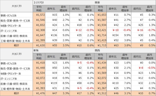 各エリアの平均時給について、関東エリアは1,715円(前年比63円増、前月比9円増)、東海エリアは1,476円(前年比47円増、前月比17円増)、関西エリアは1,512円(前年46円増、前月比10円増)となりました。