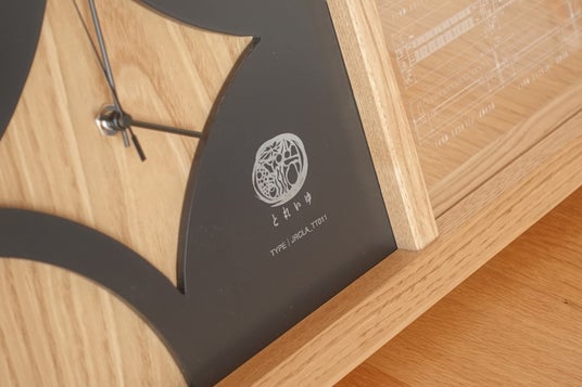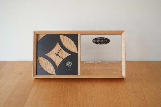 第3弾はアニバーサリークロックです。「とれいゆ つばさ」車内の天井細工を加工した時計部分や貴重な「とれいゆ つばさ」の車両図面をトレースし刻印したプレートが魅力の一品です。