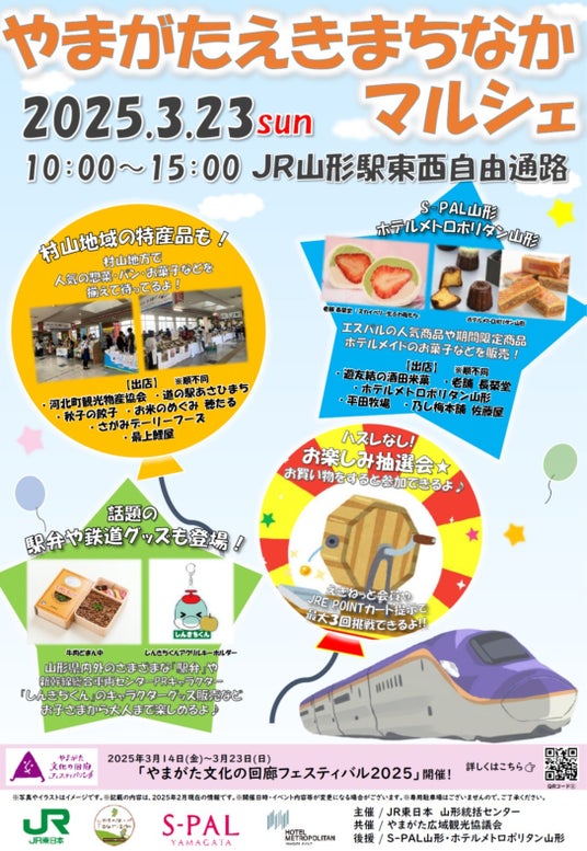 2025年3月23日(日)JR山形駅で開催される「やまがたえきなかマルシェ」で「とれいゆ つばさ」アニバーサリークロックの商品展示を行います。