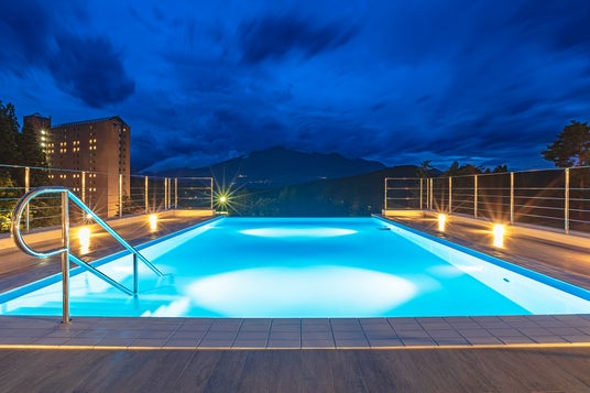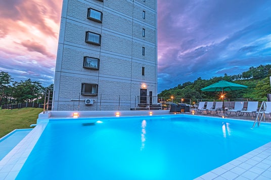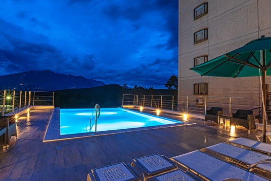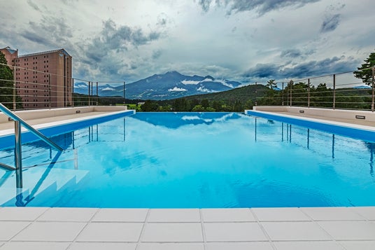 インフィニティプールとは、水面をギリギリまで上昇させてプールサイドにある縁を見えなくするよう設計されたプールのことで、同施設では妙高山が位置する西側の面が空と正面に望む妙高山に同化して、空中に浮いているかのような景観を楽しむことが出来る。
