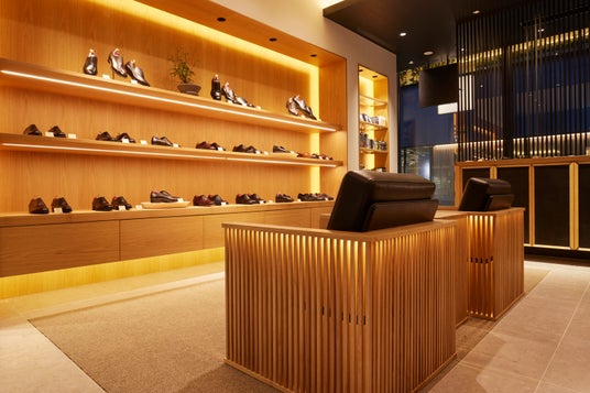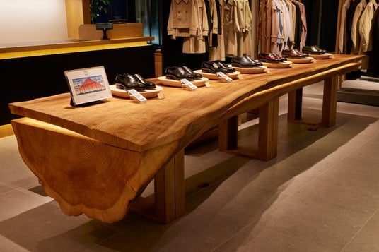 店内中央には、山形県鶴岡市の金峯神社から特別に譲り受けた御神木を使用した、縦1.3m、横4.4mの特大テーブルを設置しています。浮造り加工を施すことで木目を際立たせ原木本来の風合いを残し、また、樹木内部に間接照明を配し柔らかな光が漏れ出ることで、和の趣と自然と現代の調和を演出しています。店内の家具は、職人が角を丁寧に磨き上げ、カウンターテーブルや陳列什器の側面や天板等には「三陽山長」の革靴にも使用している革を張り、今後店舗スタッフが靴と同様に磨いていくことで深みと愛着が増すように計画しています。そして、お客さまの快適な靴選びを考慮し、店舗奥には周囲を気にせずフィッティングができる特別なスペースを設けました。オリジナルデザインのフィッティング用ソファを配置し、リラックスして靴選びを楽しんでいただけます。