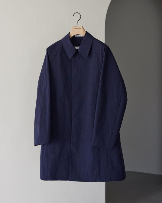 写真は青森県産のダウンライナー付きの『アンブレラコート』(14万3000円)で、「三陽山長」一部の店舗のみで販売する限定カラーのネイビー。このネイビー色は「三陽山長」のブランドカラーである「勝色」を表現しています。