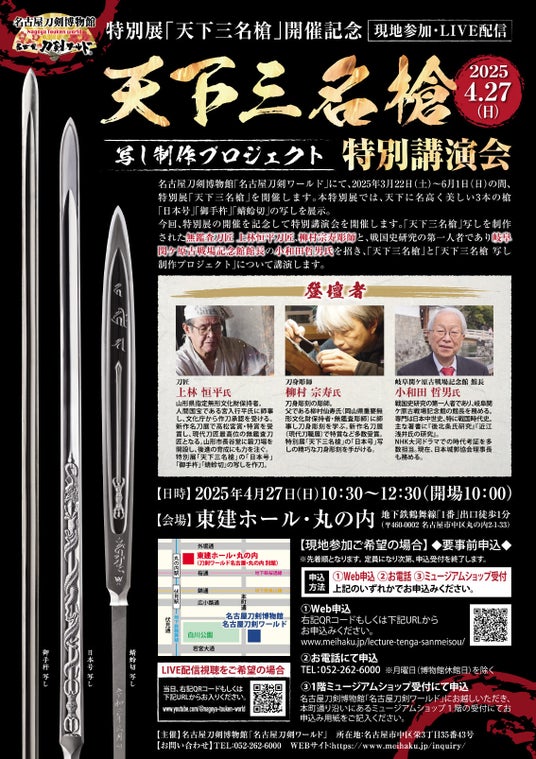 この度、本特別展の開催を記念して特別講演会「天下三名槍と写し制作プロジェクト」を2025年(令和7年)4月27日(日)、東建ホール・丸の内(愛知県名古屋市)にて開催いたします。