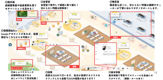 お子さまを学習塾に通わせる親御さまにとっては「送迎時間や負担」「子ども一人での行き帰りの安全面」などが不安要素として挙げられます。また社会環境として、少子化に伴って地方の学習塾が減り「都市部のほうが良い教育が受けられる」という教育格差も広がっています。「類塾プラス バーチャル校」はそれらの課題を解決できるだけでなく、生徒のアバター同士が近寄ると「個別チャットが立ちあがったり」、自習室では「同じ時間に勉強している他の生徒の様子がわかったり」とお互いを意識した限りなく現実の塾に近い環境を用意しています。この環境は、今の子どもたちが喜ぶものとなるよう、受講生らの声が反映された学びのメタバース空間となっています。
