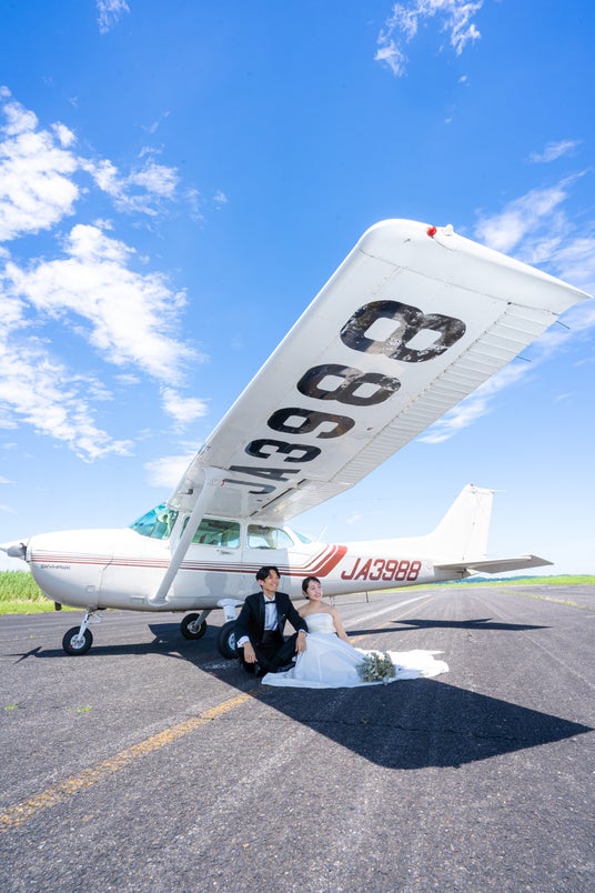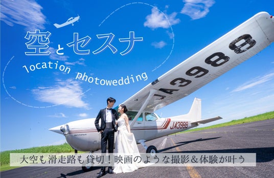 新プラン「空とセスナ@竜ケ崎飛行場」は、様々なアーティストのMVやドラマ映画の撮影場所としても有名な「竜ヶ崎飛行場」で貸切フォトウエディング撮影ができるプランです。竜ヶ崎飛行場は、弊社ガーデン&邸宅ウエディング「アルシェ」から車で10分の距離に位置し、大空を背景に迫力のある飛行機と開放感溢れる映画のワンシーンのような撮影が可能です。