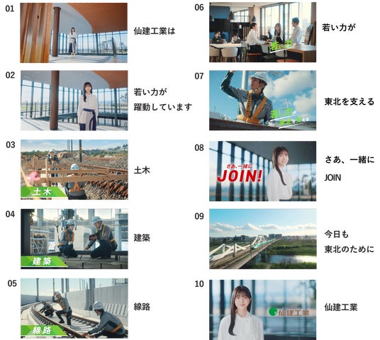 今回の新CMでは、高い技術力で豊かな社会を築く「土木部門」、愛される建築物で地域の街づくりに貢献する「建築部門」、ミリ単位の管理で鉄道の安全と乗り心地を実現する「線路部門」。当社を支える3部門それぞれで、「今日も東北のために」活躍している若い社員の姿を、乃木坂46の久保史緒里さんに伝えていただいています。