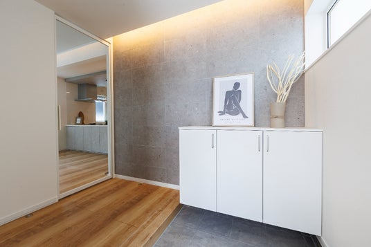大きな窓と木目に癒される開放感あるリビング。親しみやすい柑橘と穏やかなラベンダーの香りが、家族が集う空間を居心地よく満たします。テレビボード裏の壁にタイマー設定で稼働するディフューザーを組み込み、居住者が操作することなく、空間中に香りを広げます。