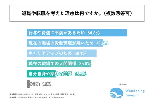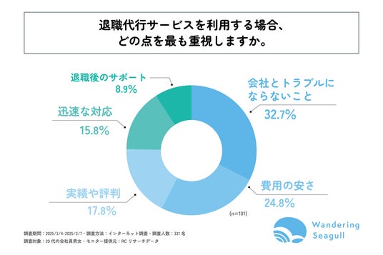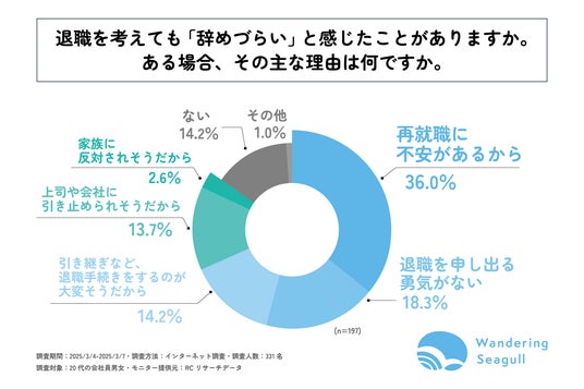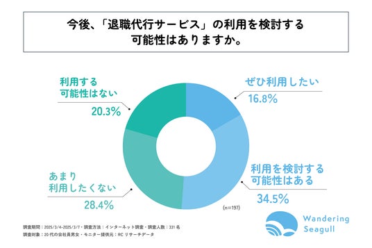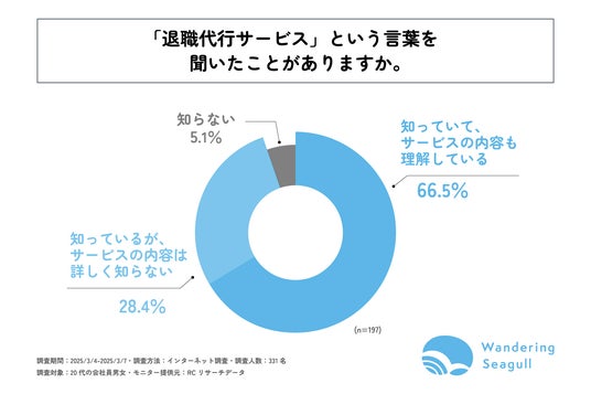 株式会社Wandering Seagull(本社:新潟県 、代表取締役:田村 広流)が運営する「退職代行だいじょうぶ」は、20代の会社員を対象に「退職代行サービスの認知度と利用意向に関する調査」を実施しました。この調査結果から、20代の若手ビジネスパーソンの退職代行サービスの認知度とサービスの利用意向等が明らかになりました。