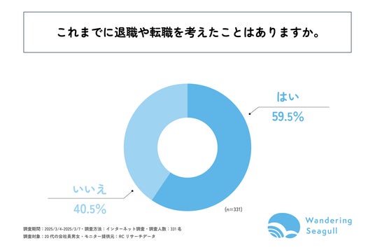 まず、「これまでに退職や転職を考えたことはあるか」を問う設問への回答では、「はい」が59.5%、「いいえ」が40.5%という結果になりました。この結果から20代の会社員の約6割がこれまでに退職や転職を考えたことがあることが明らかになりました。