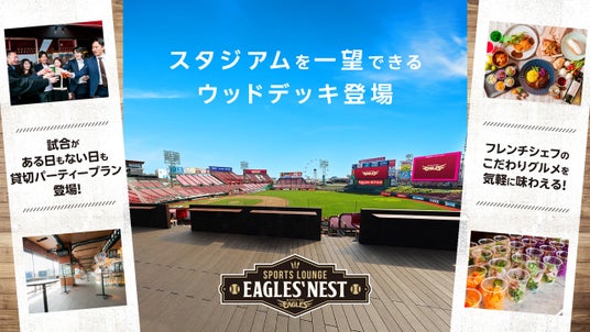 楽天モバイルパーク宮城1塁側の「EAGLES'NEST」に、新たに「ウッドデッキ」が誕生いたします。スタジアム全体を見渡せる最高のロケーションで、開放的な空間の中、ゆったりと野球観戦をお楽しみいただけます。どなたでもお気軽にお立ち寄りいただける憩いの場としてご利用ください。
