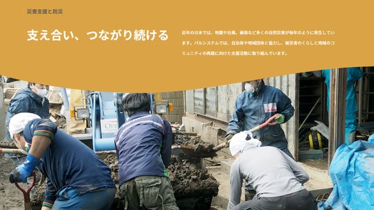 「災害支援と防災」は、相次ぐ自然災害に対し、物資の提供や募金活動のほかに、被災地域への人員派遣を通じて暮らしの再建に貢献する活動を報告しています。
