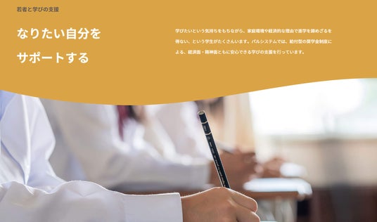 「若者と学びの支援」では、パルシステムグループが運営する大学生、短大生、専門学生を対象とした「パルシステム給付型奨学金」と、神奈川県内の高校生が対象の「神奈川ゆめ奨学金」を紹介します。