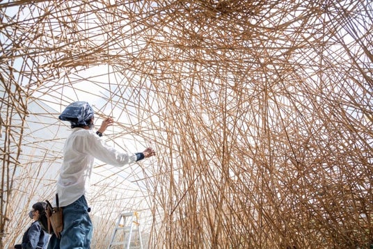 「茅」は屋根を葺くための材料の総称で、かつては日本全国で見られました。現在では草原が減少した結果、その産地は限られ、阿蘇や御殿場、北上川の河口など全国でも僅かになってしまいました。大阪・関西万博のシグネチャーパビリオンのひとつで建築家・隈研吾氏が設計、小山薫堂氏がプロデュースする「EARTH MART」では、阿蘇をはじめ全国5か所で刈り取られた“茅”が屋根の素材として大胆に使用されています。茅は、かつて里山の暮らしにあった営みの循環の象徴であり、小さな屋根の集積は市場のようにその繁栄と賑わいを表現しています。会期後には、別の場所で再び茅葺きとして再利用される予定です。茅を刈取り草原を利用することで、多様な里山の生態系が維持されることにもつながっていきます。